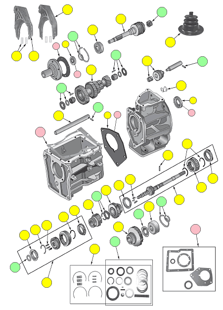 - Includes Input Seal, Output Seal, Transmission Case to Adapter Gasket, Shift Cover Gasket, and Input Bearing Retainer Gasket